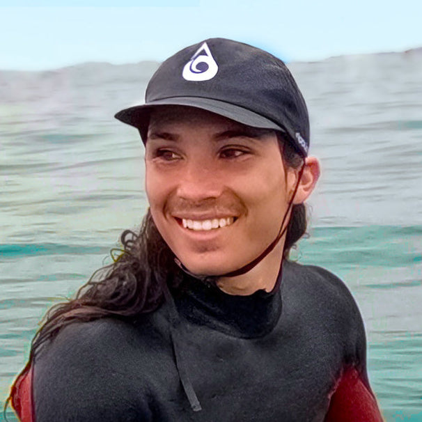 An eco-conscious baseball-style surf hat that stays on your head, in and out of the water, doing what you love!